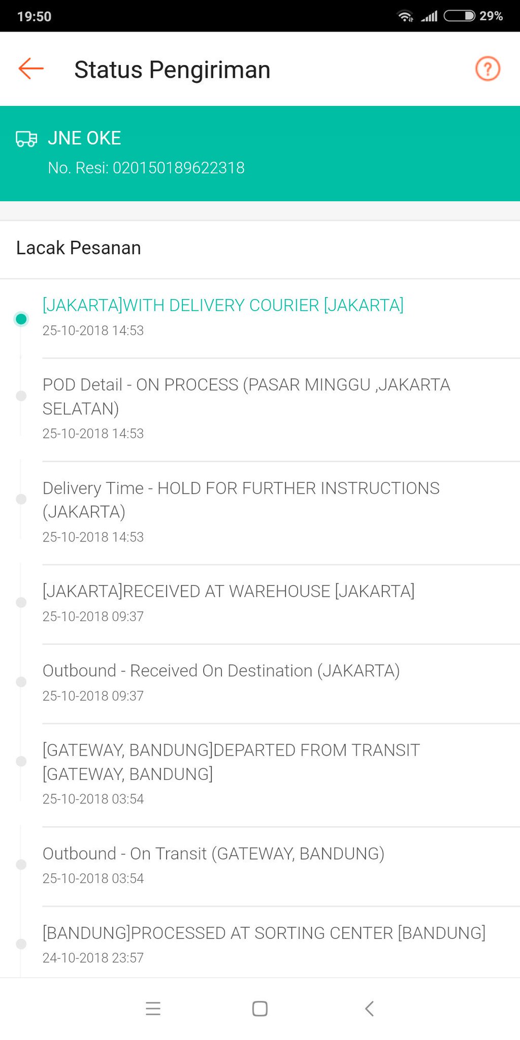 With Delivery Courier JNE. Tapi pada saat saya ke kantor jne wirehouse status paket milik saya sudah menjadi with delivery courier artinya yaitu paket yang semua berada di kantor jne wirehouse ternyata sudah di. Lalu dalam proses pengiriman oleh kurir artinya atau.